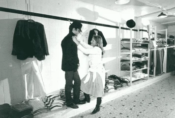 アニエスベーは最初のショップをパリのレ・アール地区にある古い肉屋を全面改装して開業しました。その地区は当時急激に発展している最中でした。この1号店は、オフィスやアトリエとしてだけでなく、表現の場、あるいは出会いの場としても使われました。壁には、グラフィティや、様々なポスターが貼られ、鳥が自由に飛び回り、座って会話を楽しみ、音楽を聴くことができる場所でした。