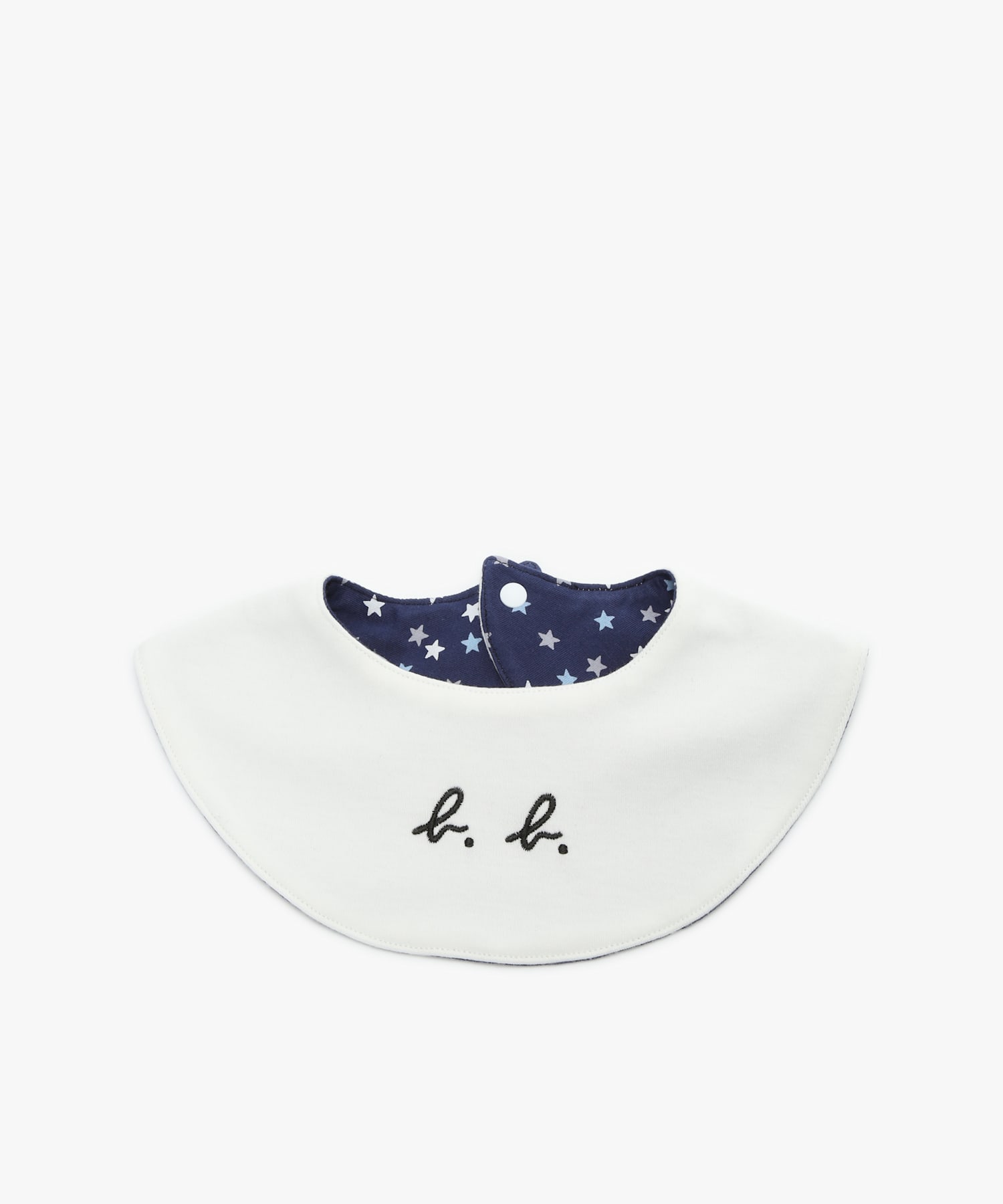 星総柄にb.がポイントで入っているアニエスベーオリジナルプリントと"b.b."ロゴ刺繍のリバーシブルスタイ。