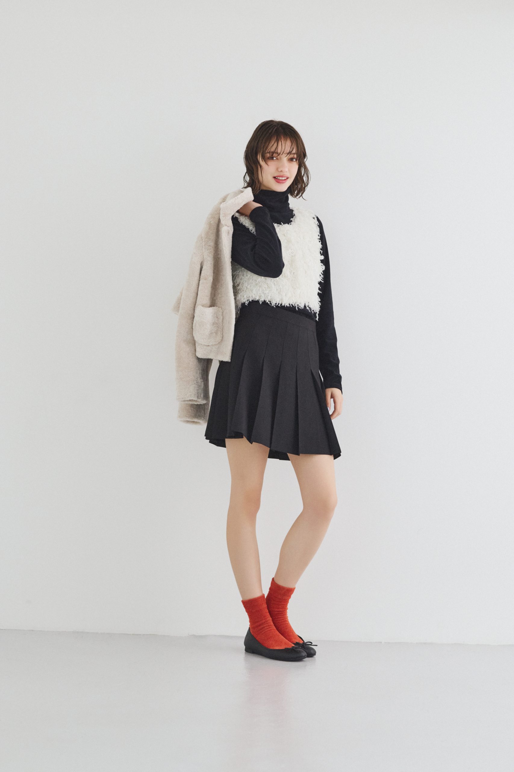 光沢感のあるスカートやビンテージ感のあるジャカードのドレス、ヘアリー素材のベストがスタイリングのアクセントに。