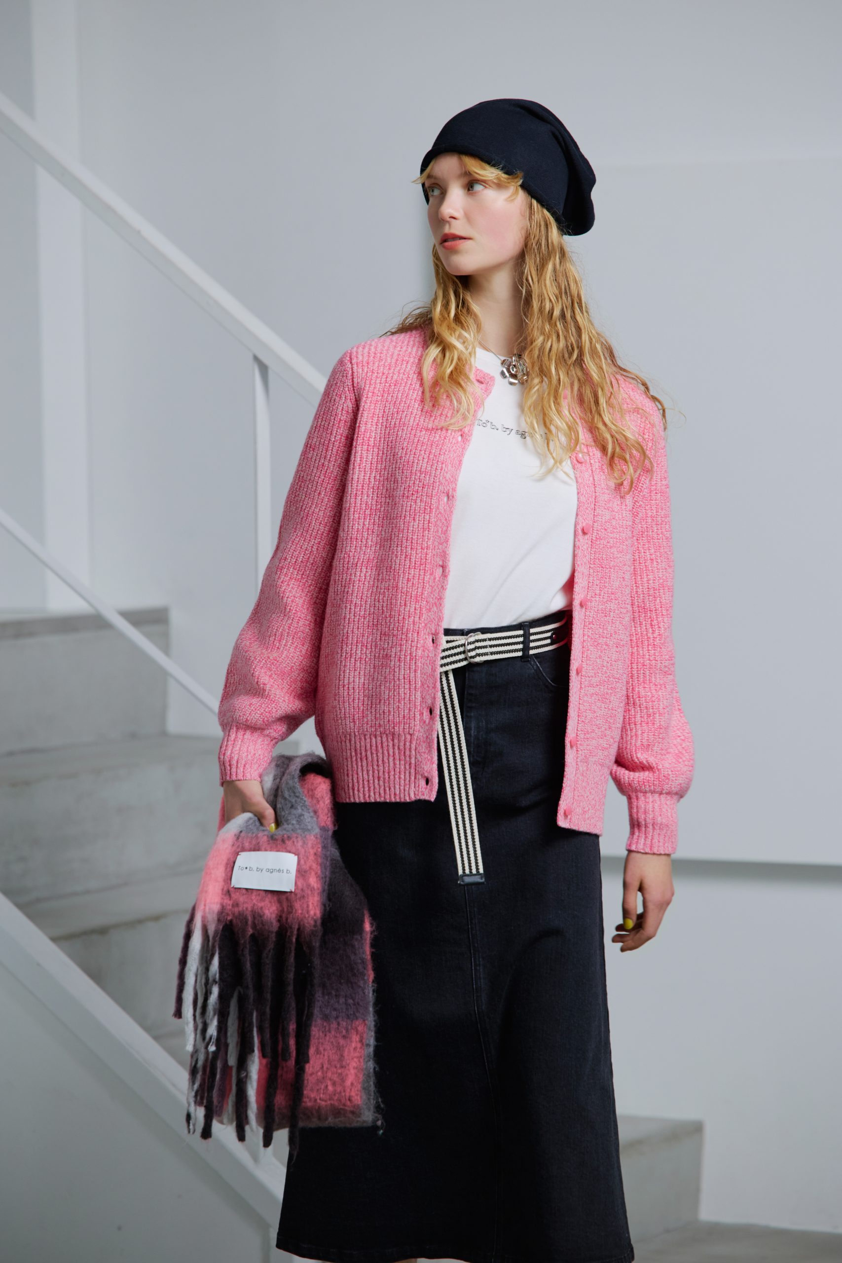cardigan ¥22,000 (税込) / long sleeve t-shirt ¥10,780 (税込) / skirt ¥26,400 (税込) / choker ¥7,480 (税込) / muffler ¥8,690 (税込)