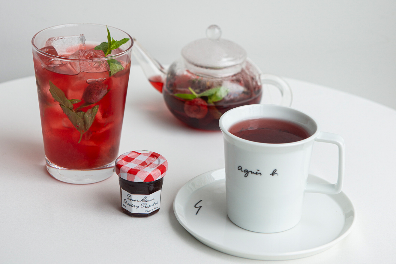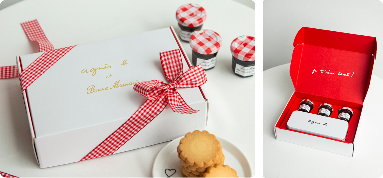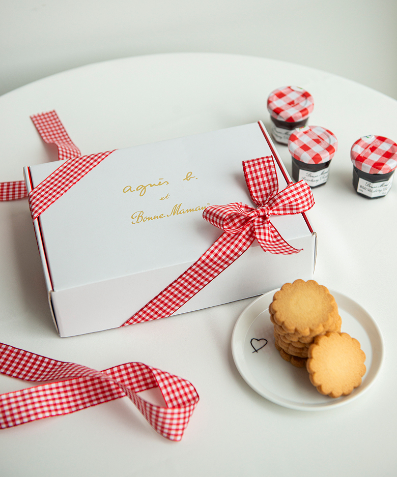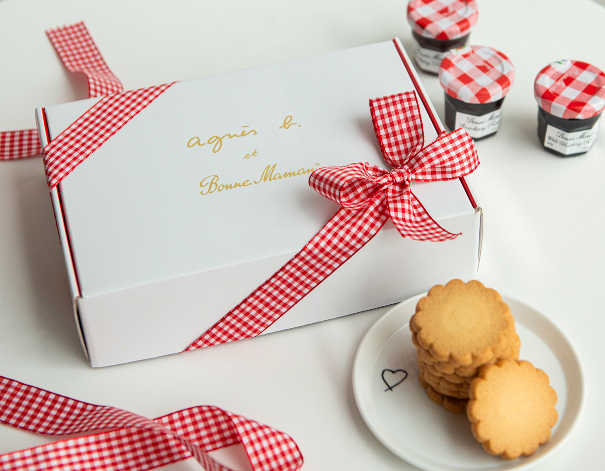 アニエスベー カフェ各店と、一部ブティックではギフトにも最適なスペシャルボックス入りのセットを販売。アニエスベー オリジナルサブレに合わせて、ボンヌママンの 3 種のジャム(ストロベリー、ブルーベリー、ラズベリー)をセレクトしました。ホリデーにもぴったりの赤いベリーの彩りと甘酸っぱさが、サブレの風味をより一層引き立てます。