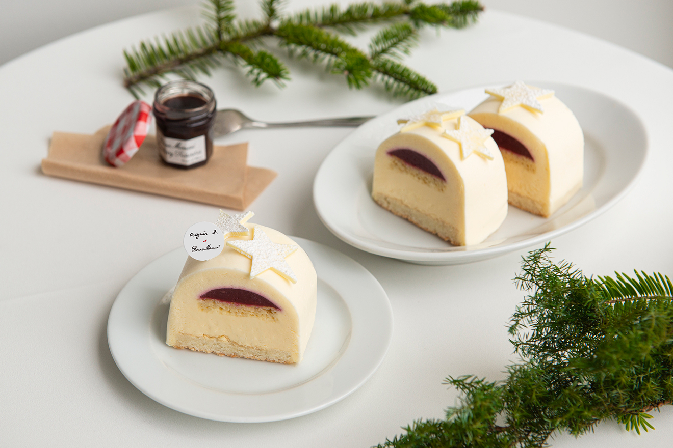 アニエスベーのアイコンのひとつエトワール(星)をちりばめたフロマージュムースの真っ白なビュッシュ・ド・ノエル。中のピューレにボンヌママンのラズベリージャムを使用しています。濃厚なフロマージュムースとホワイトチョコクリームに甘酸っぱいピューレがマッチします。