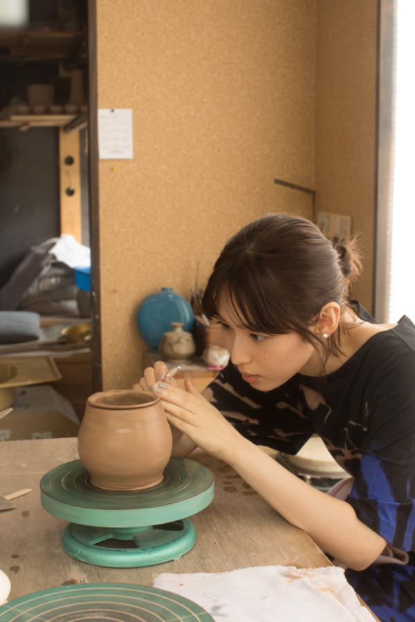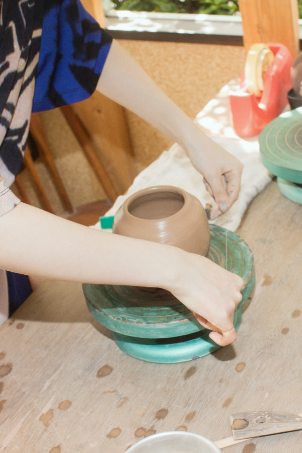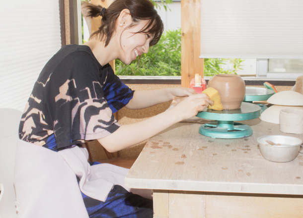 雑誌の撮影をきっかけに陶芸教室に通うようになりました。今回の撮影の前にも友人と一緒に行って。パスタ皿やアクセサリーケース、マグカップを作ったりしています。いつもは、信楽焼などに使われる強度のある赤土を使っていて、今回の撮影ではじめて手捻りの手法にチャレンジしました。手捻りは自由度が高くて、自分が思い描いた造形を追求していくのがおもしろいですね。幼い頃から手を動かしているのが性に合っていて、無心で没頭する時間がリフレッシュになっています。