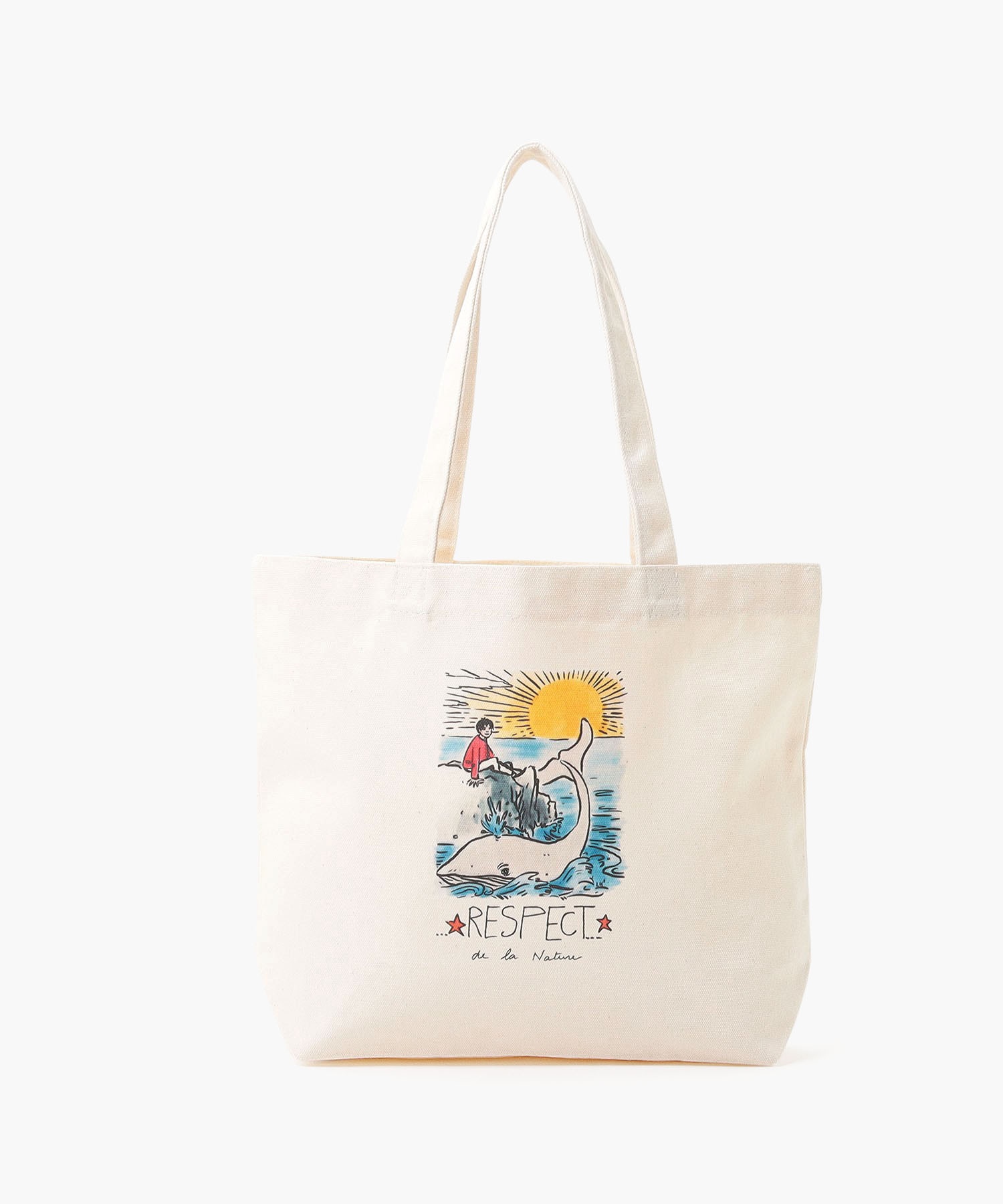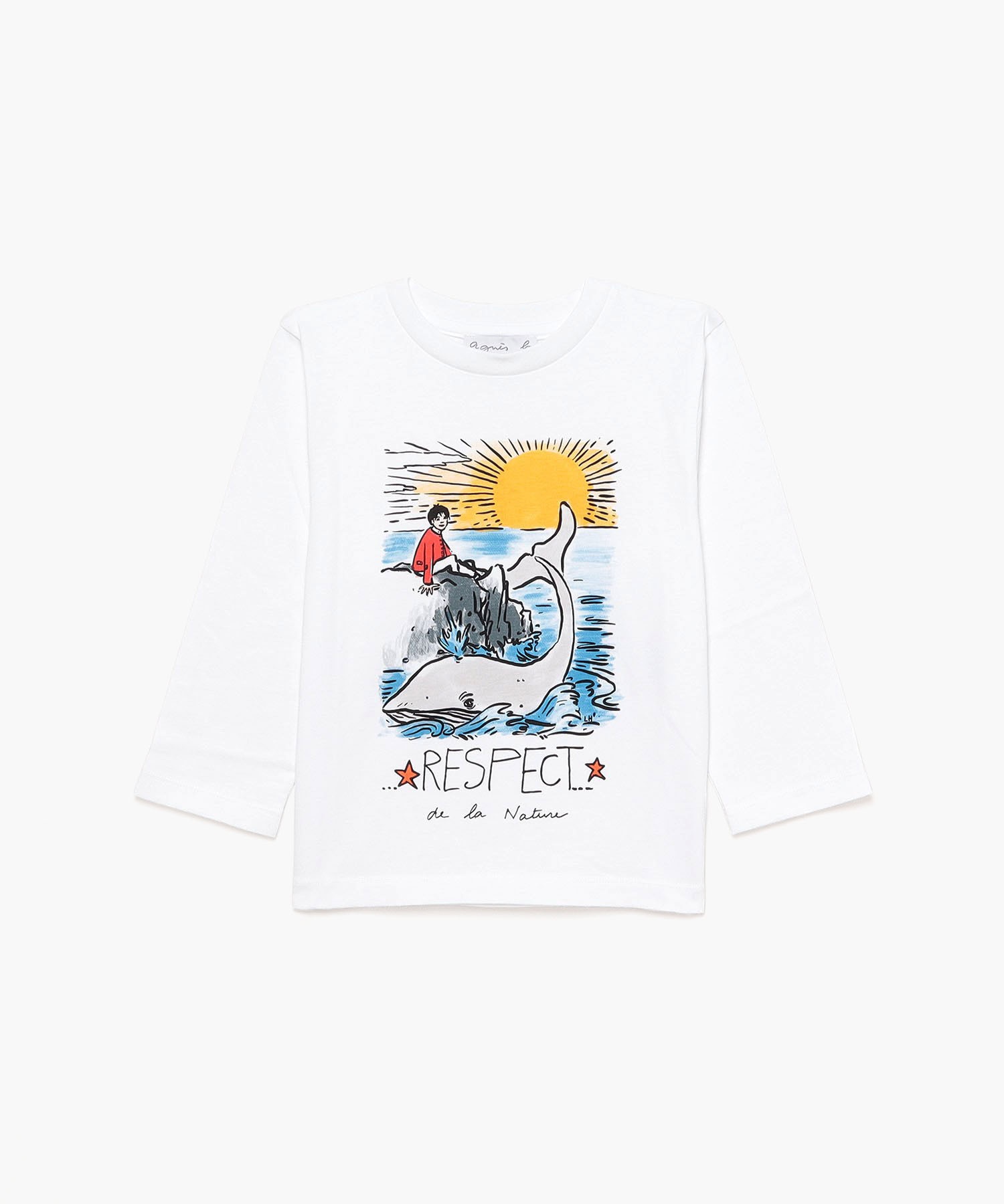 「夜明けの太陽を見つめる少年とクジラ」のイラストが入ったTシャツやトートバッグをお子さんにプレゼントして、海の大切さを一緒に考えるきっかけになるといいですね。