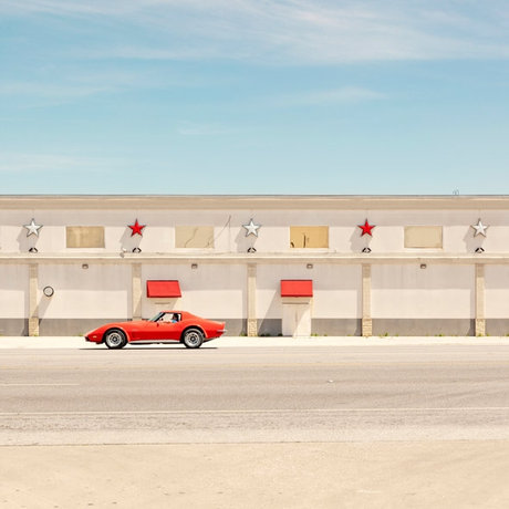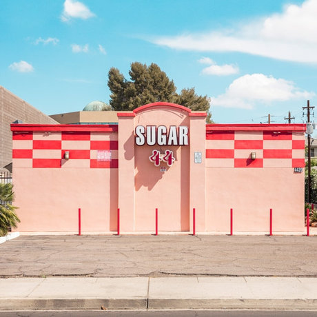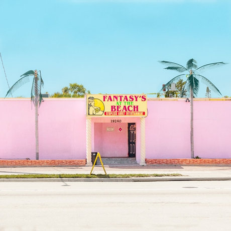 本シリーズでプロストがカメラを向けているのは、道路沿いや、スーパーマーケットやトイストアの隣に建てられた白昼のストリップクラブのファサードです。中距離から撮影された画面には、ネオンの派手な輝きも、パーティーを楽しむようにやってくる人たちの姿もなく、幾何学的なフォルムの外観と、強い太陽の光に一層映えるパステルカラーがニュートラルに写しだされます。