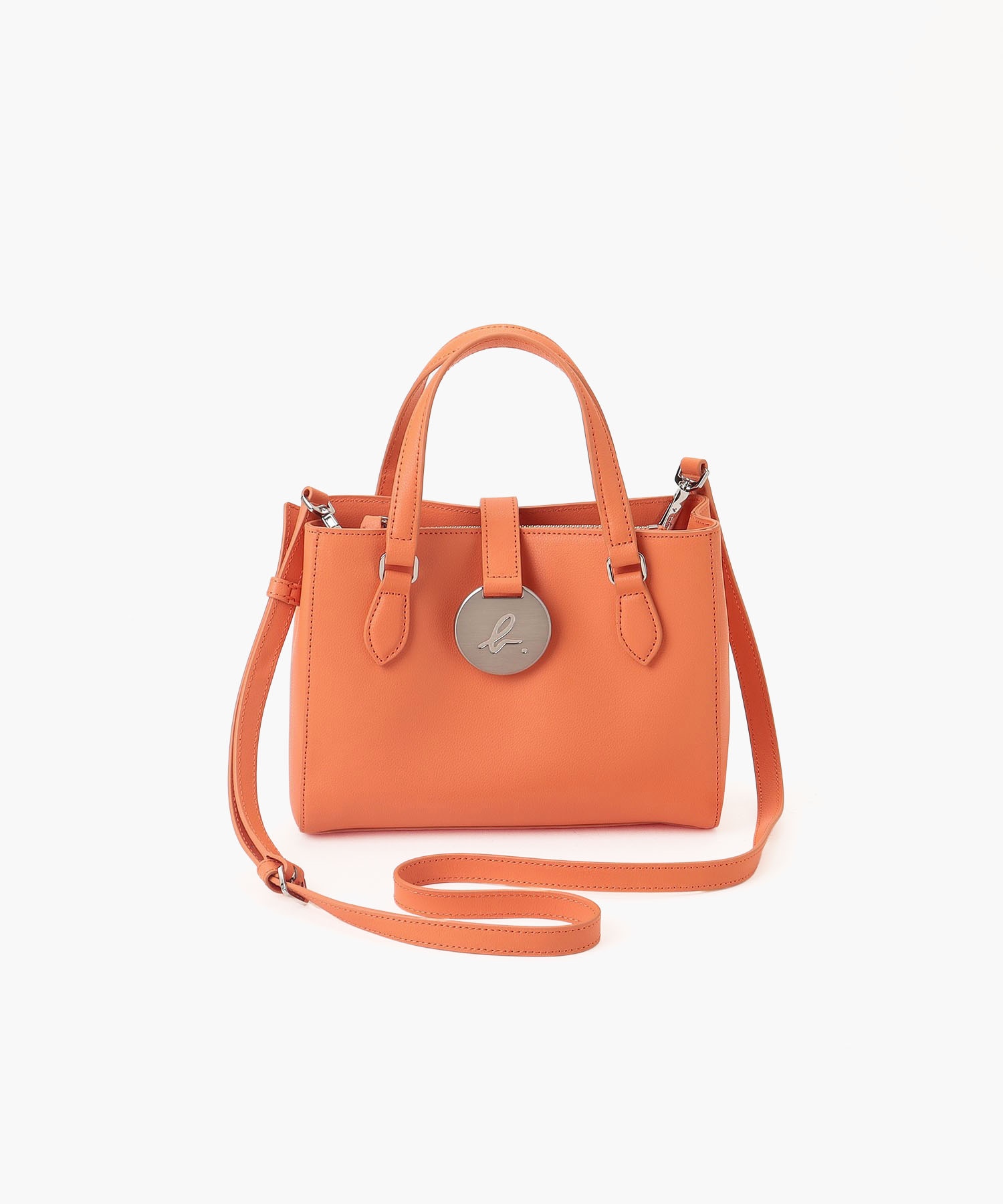"b,"を型押ししたラウンド型のメタルプレートがアクセントに光る、ミニマルな2wayトート。