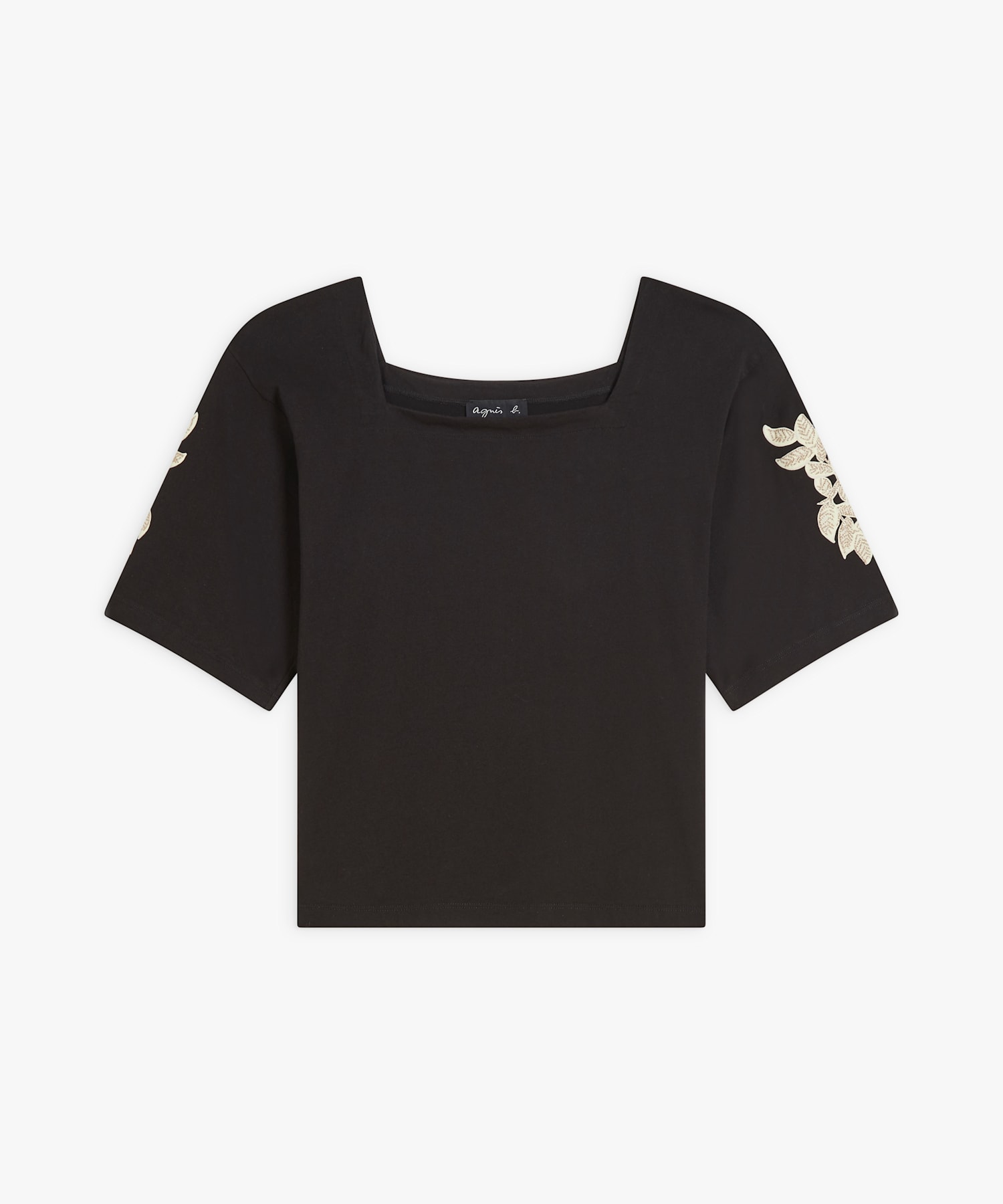 スリーブあしらったリーフモチーフの繊細な刺繍が、スペシャル感を生み出すアクセントに。シンプルに一枚で着こなすだけでもどこかワザありなスタイリングに仕上がるスクエアネックのカットソーは、上質なコットン素材の優しい着心地も魅力的。