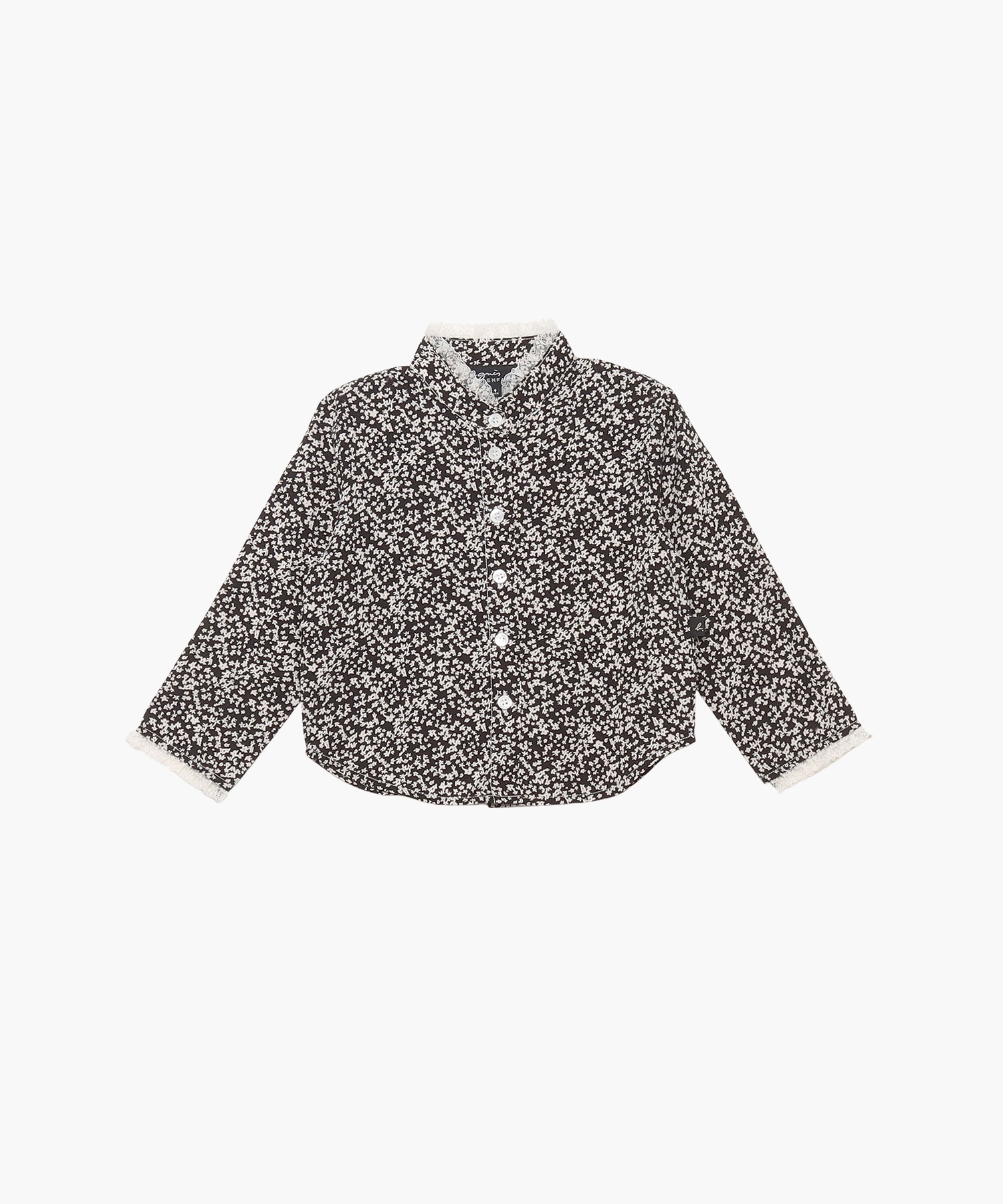 小花柄がたっぷりとプリントされたシャツ。襟にはフリルがあしらわれ、ガーリームードを後押しします。モノトーンでちょっぴり大人っぽく仕上げました。スカートにもパンツにもよく似合うアイテムになっています。
