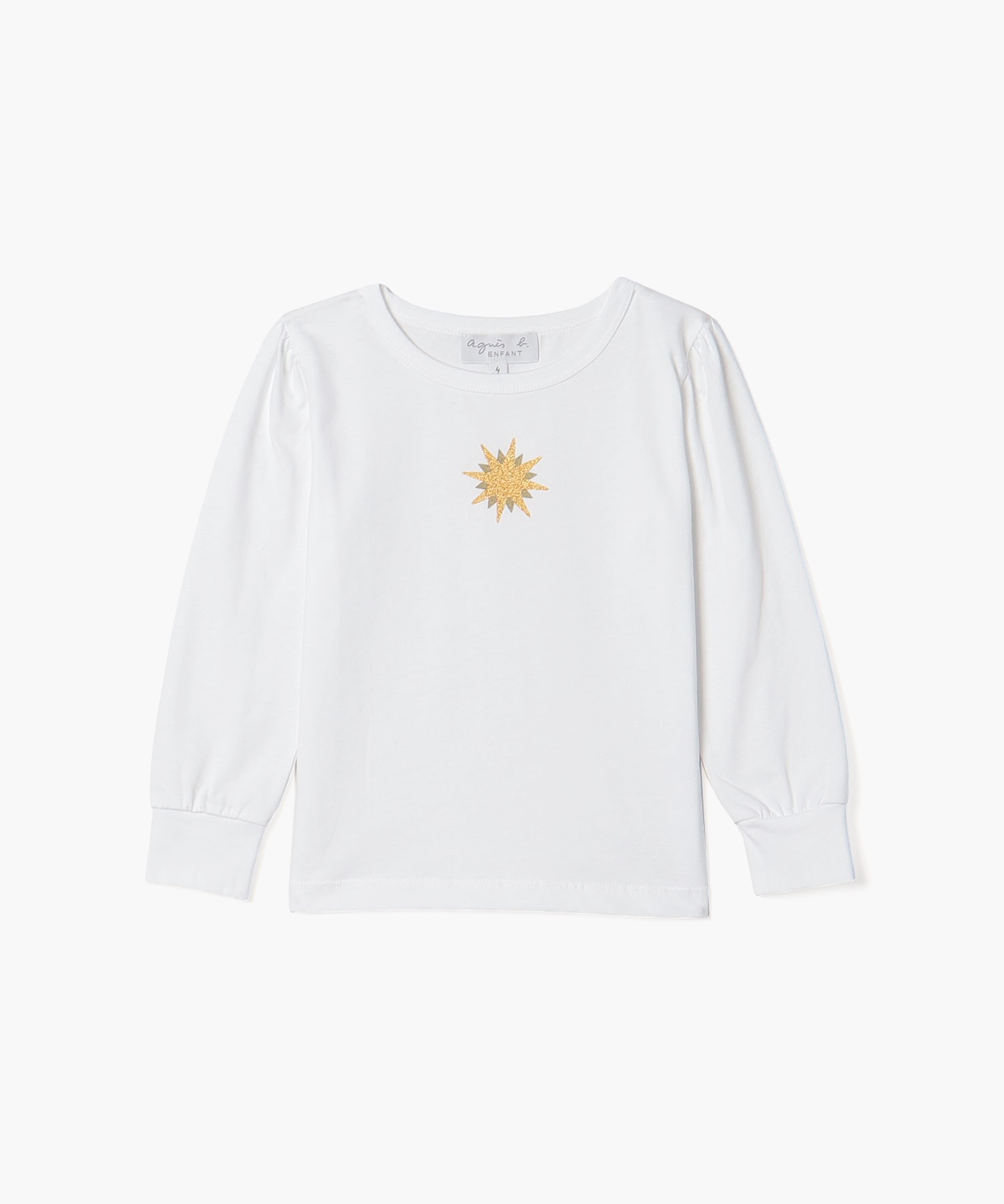 太陽のようなモチーフにキラキラと輝くラメを散りばめて、ポップな華やぎをプラス。ふんわりスリーブで女の子らしいディテールも取り入れたラウンドネックの長袖Tシャツは、ナチュラルなコットン素材でデイリーに愛用OK。