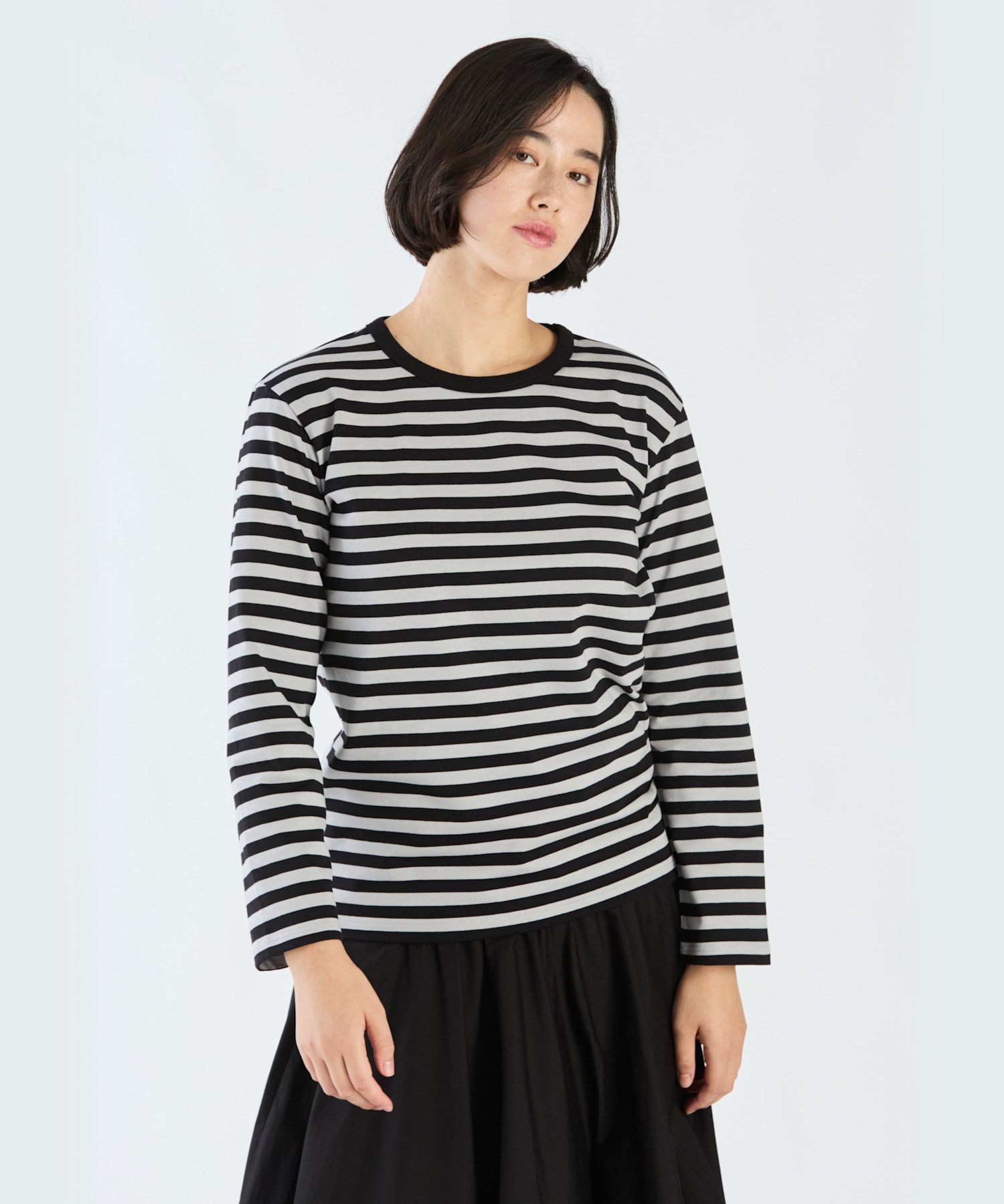 細やかなボーダー柄がコーディネートのアクセントになってくれる、クルーネックの長袖Tシャツ。オーソドックスなシルエットだからどんなボトムスとも好マッチ。トレンドに左右されない定番トップスとして愛用したくなる一枚です。