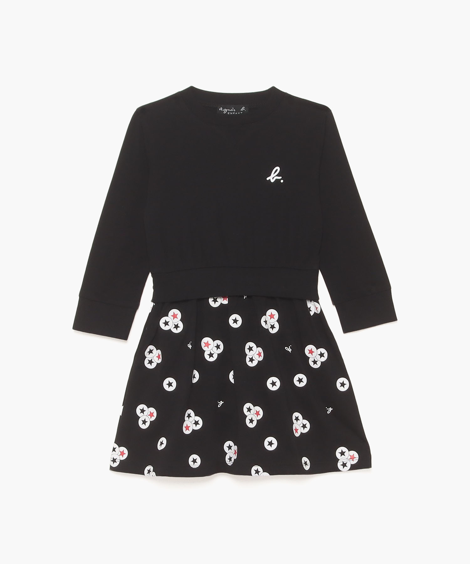 丸で囲ったエトワール柄とb.ロゴがランダムに散りばめられたインパクトたっぷりのワンピース。無地に切り替えたトップ部分は胸元にb.ロゴのワンポイントをオン。1枚着でもオシャレをアピールできるからヘビロテしそうです。