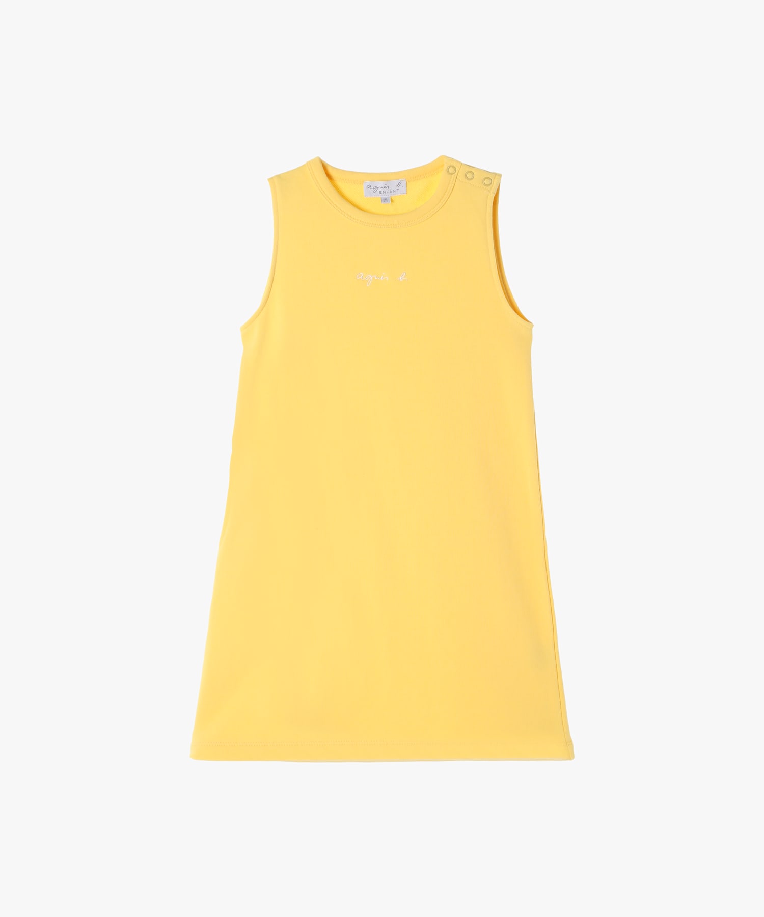 フロントにあしらったブランドロゴ刺繍がワンポイントになってくれるキッズノースリーブワンピース。
