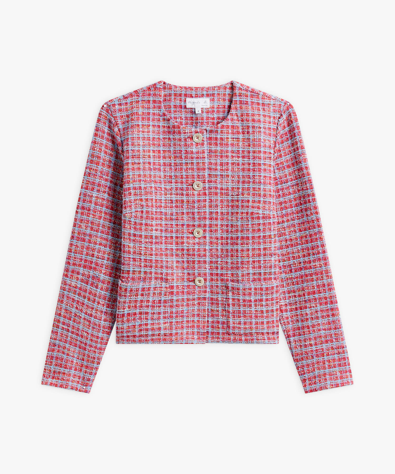 愛らしいチェックのカラーにゴールドのボタンが華やかなな1枚。