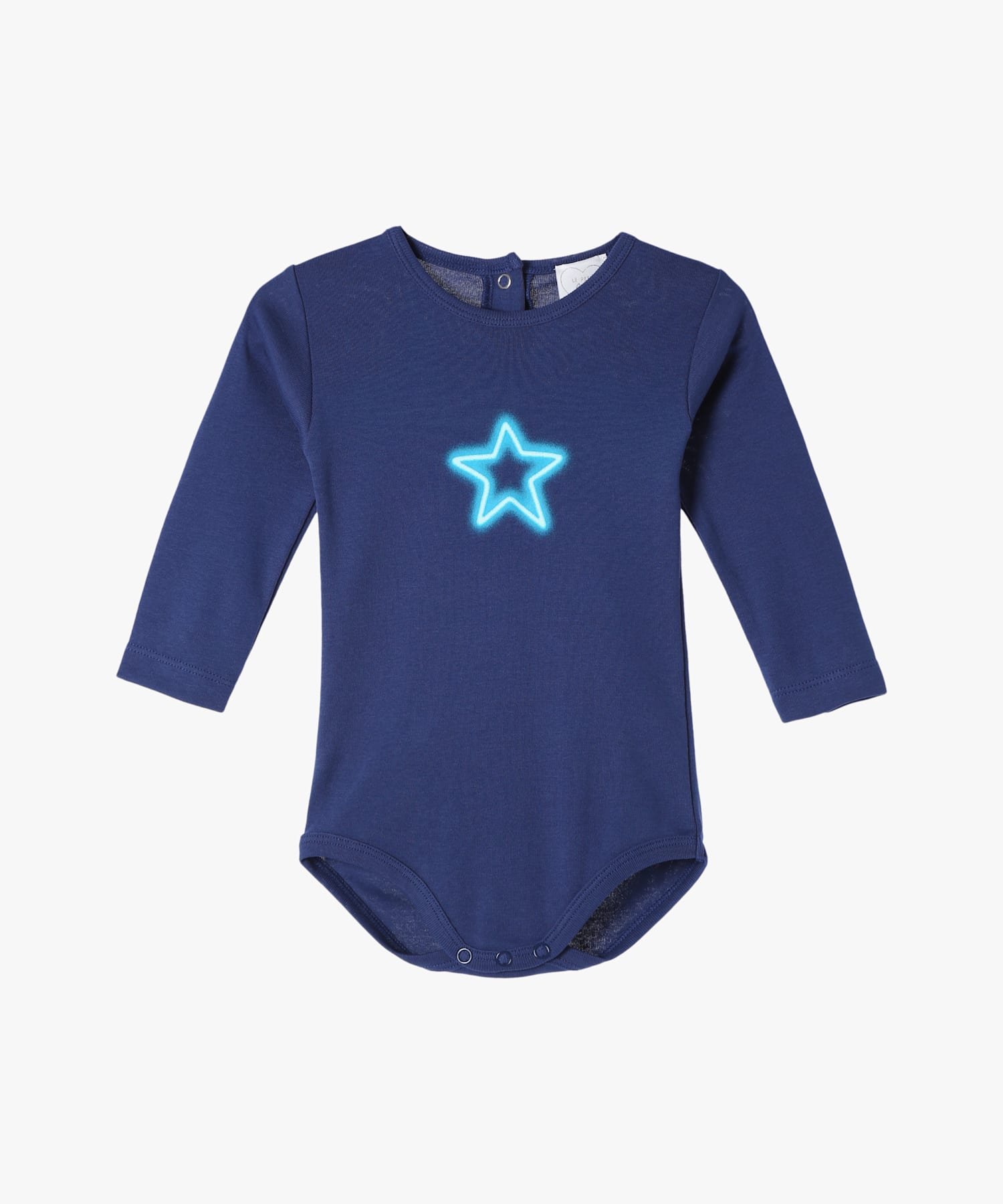 スマートなデザインのロングスリーブロンパース。コットン100%で優しい着心地に、フロントにはPOPな光をまとった、スターのデザイン。