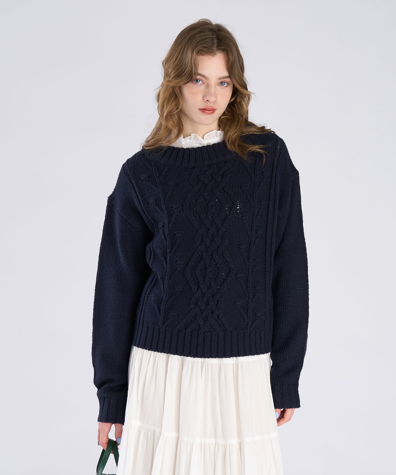 太めの膨らみ感のある糸を使用しているのでぷっくりとした立体的な柄が可愛く温かみのあるニットです。