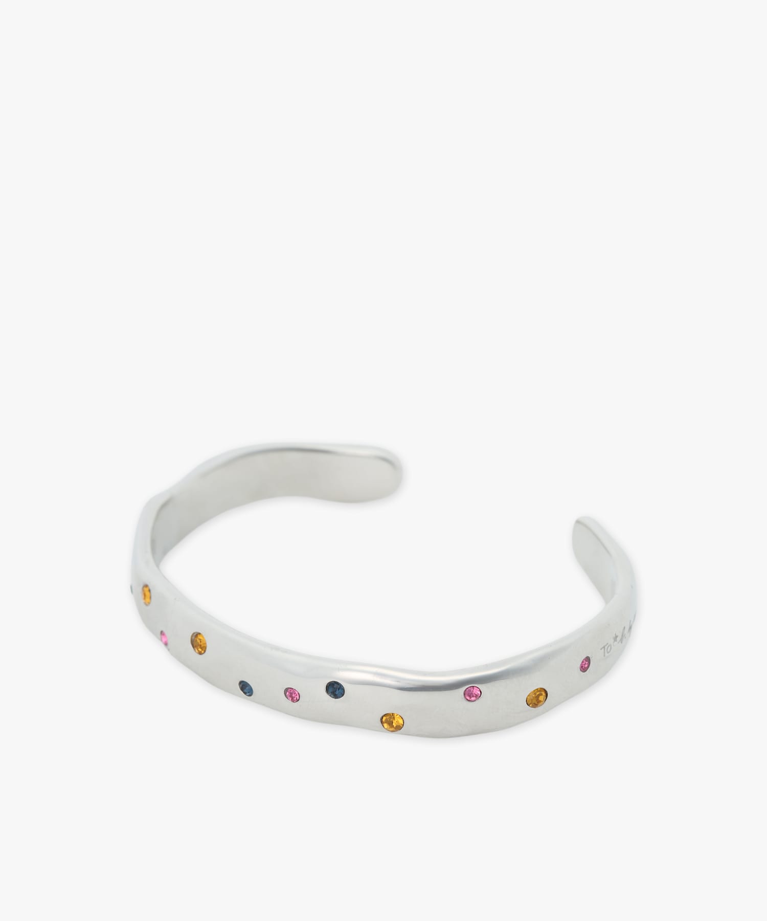マルチカラーのビジューが手元にきらめきを添える華やかなバングル。