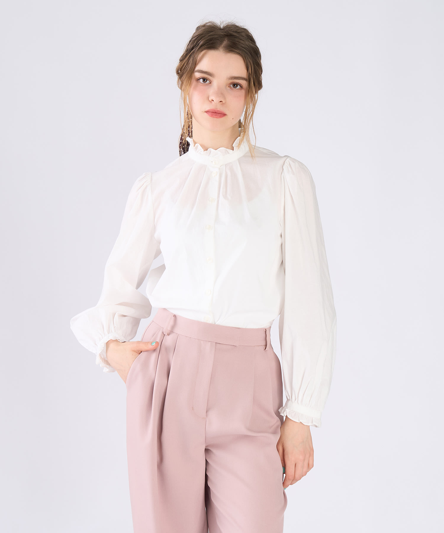 台衿フリルとふくらんだ袖口がかわいい長袖ブラウス。