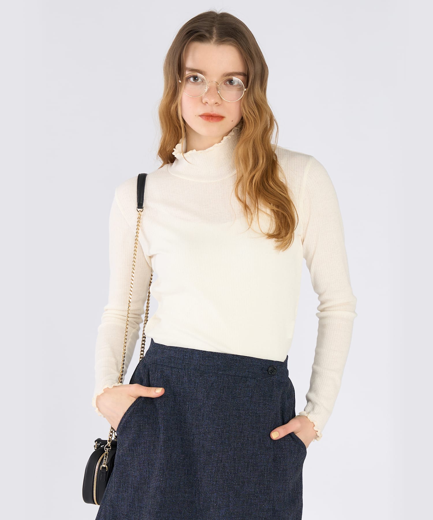 糸の形状を活かしたシボ感のあるナチュラルな表情が特徴のソフトな風合いのリブ素材を使用したハイネックインナー。