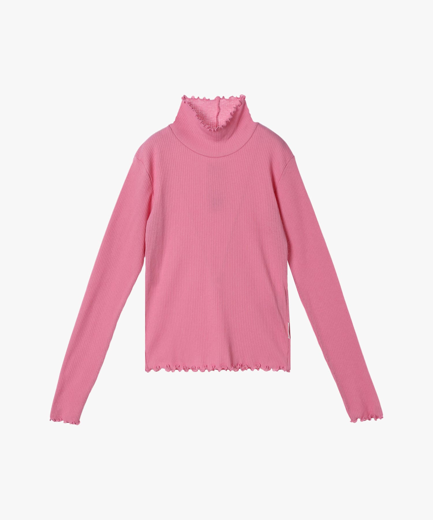 糸の形状を活かしたシボ感のあるナチュラルな表情が特徴のソフトな風合いのリブ素材を使用したハイネックインナー。