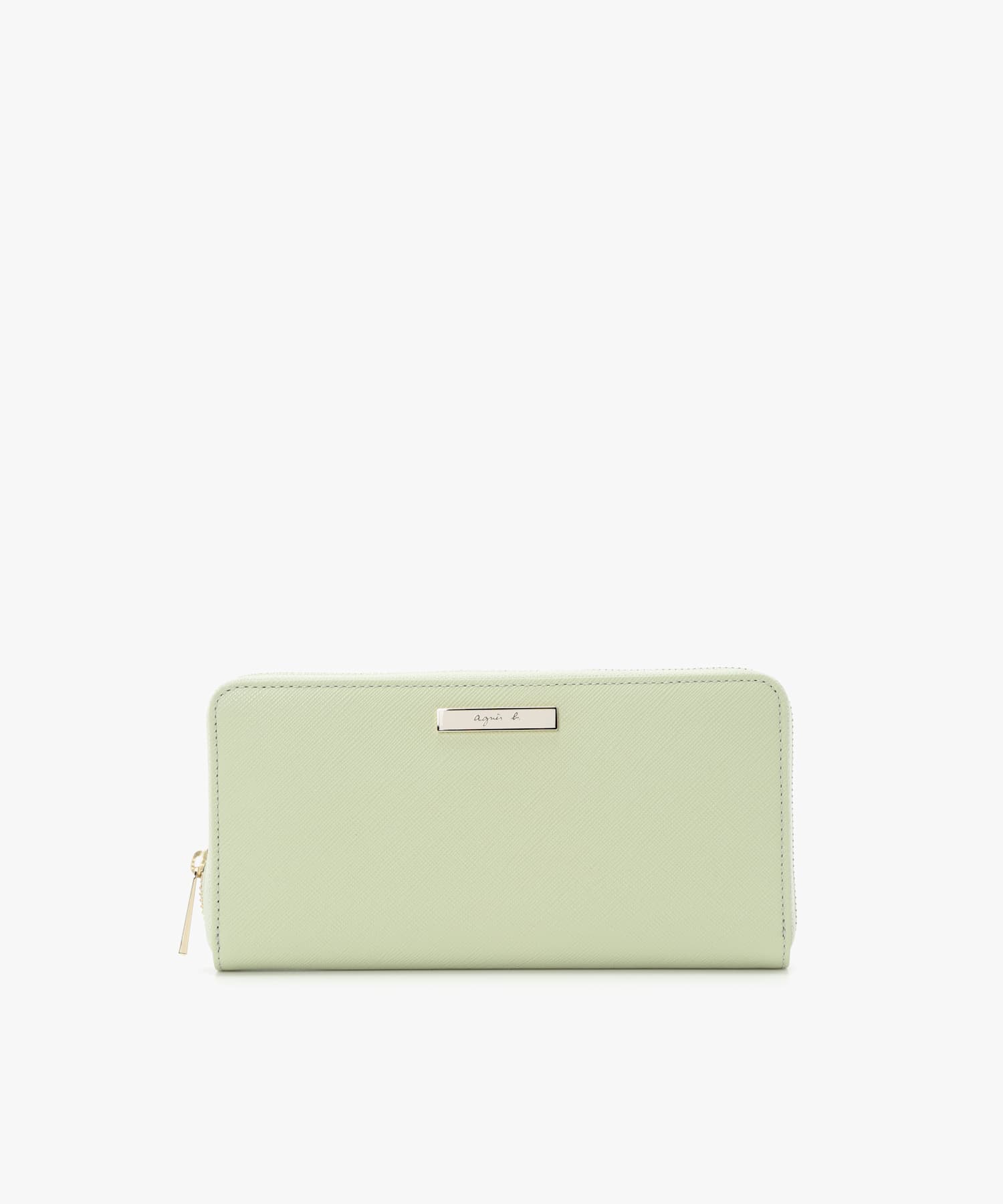 ライトゴールドを効かせたロゴプレートがポイントのラウンドジップロングウォレット。