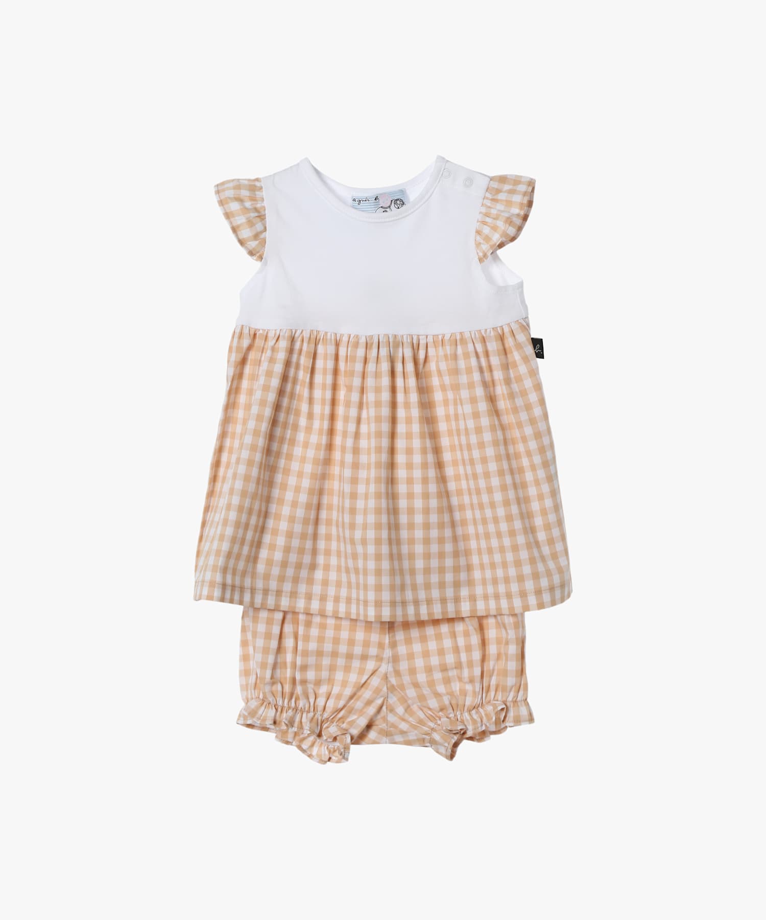 フリルがかわいらしいギンガムチェックのワンピースとブルマのセットアップ。