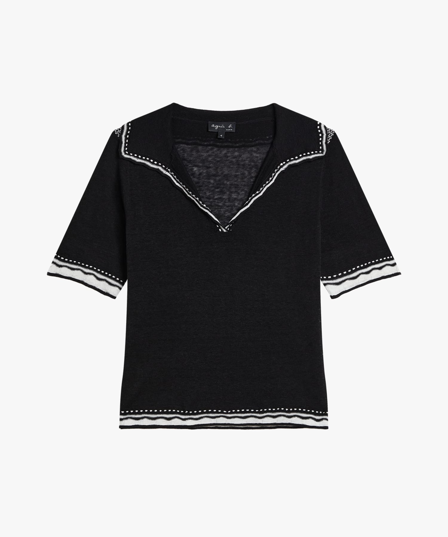 襟や肩、袖口、裾部分にインターシャ編みをあしらったニットポロ。