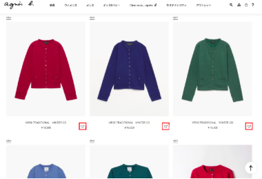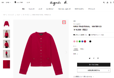 商品の一覧ページや商品詳細ページでハートのマーク お気に入りアイコン を押していただくことでお気に入り商品に登録することができます。